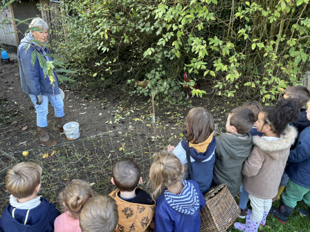 Sous un grand soleil, nous avons salué les poules et le coq du jardin, puis munis de nos jolis paniers, nous sommes allés sous le noyer pour ramasser ses noix.