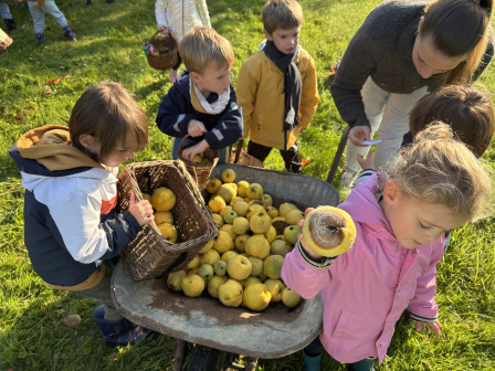 En descendant le jardin, nous avons découvert ce qu'était un cognassier. Nous avons ramassé des coings tombés sous l'arbre et touché leur peau. Nous avons découvert l'intérieur de ce fruit et touché ses pépins glissants. Nous avons même goûté à des pâtes de fruits préparées à base de ce fruit. Un délice!