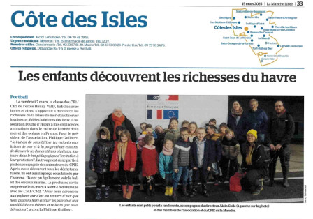 Le vendredi 7 mars, les élèves de la classe de CE1-CE2 de l'école Henri Vally de Portbail sont partis à la découverte du havre de Portbail guidés par Rémi et Emilie, animateurs natures du CPIE du Cotentin.