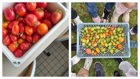 Nous avons récolté les tomates rouges du jardin avec la classe d'Ines (classe de CM1A). Plus tard, nous avons récolté toutes les tomates qui restaient dans le jardin, surtout les vertes.