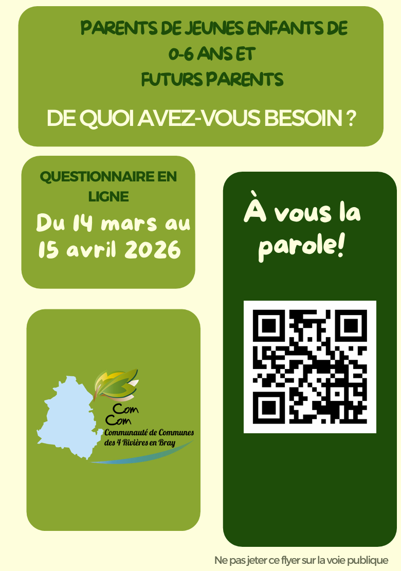 En lien avec le Contrat Local de Santé, Le service Petite Enfance de la CC4R en Bray propose un questionnaire aux parents d’enfants de 0/6 ans et futurs parents afin de faire un diagnostic petite enfance et guider nos futures actions d’accompagnement à la parentalité sur le territoire.