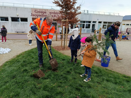 Dans le cadre de l’aménagement des espaces nouvellement végétalisés de l’école, les élèves, de la maternelle au CP, sans oublier les élèves du dispositif ULIS, ont participé à une action citoyenne et écologique : la plantation de bulbes et de quatre jeunes sapins.