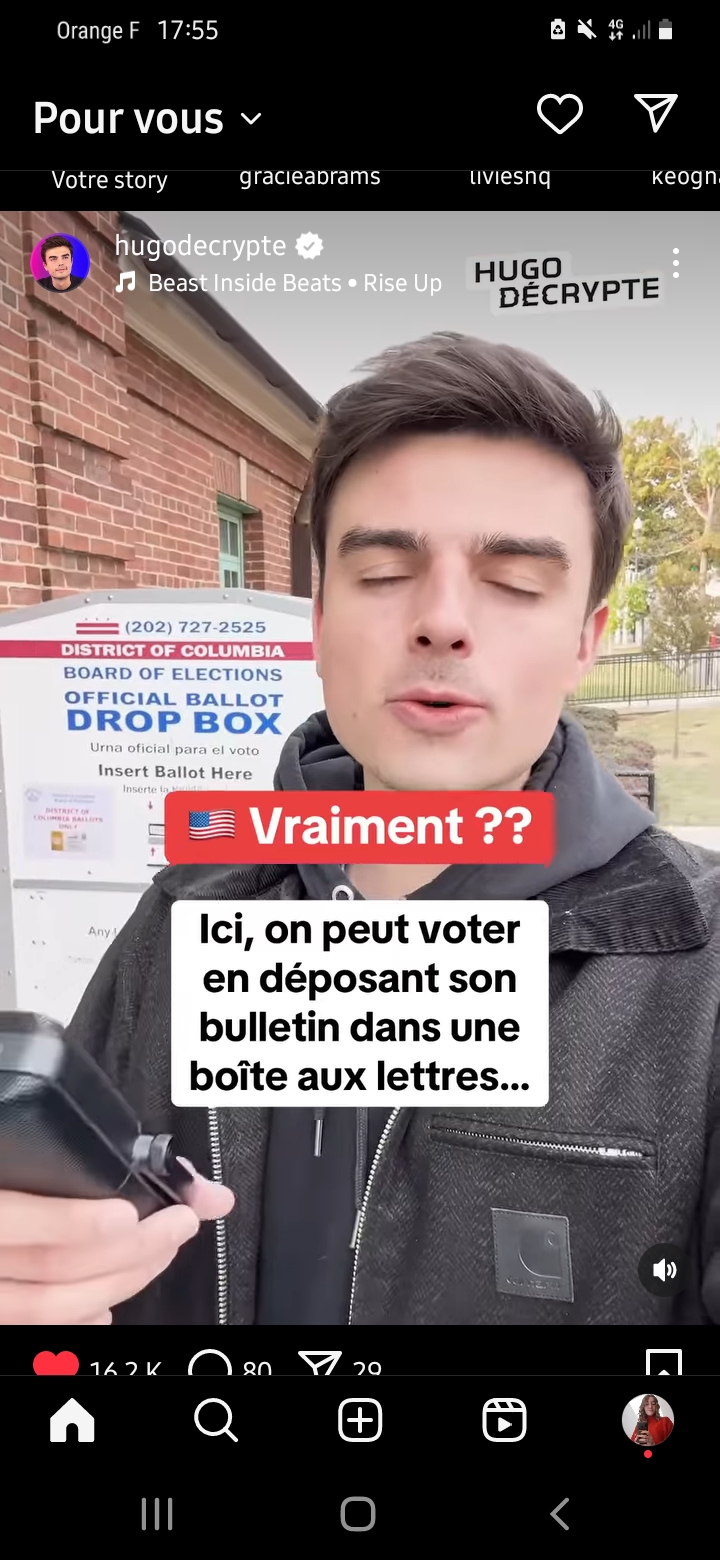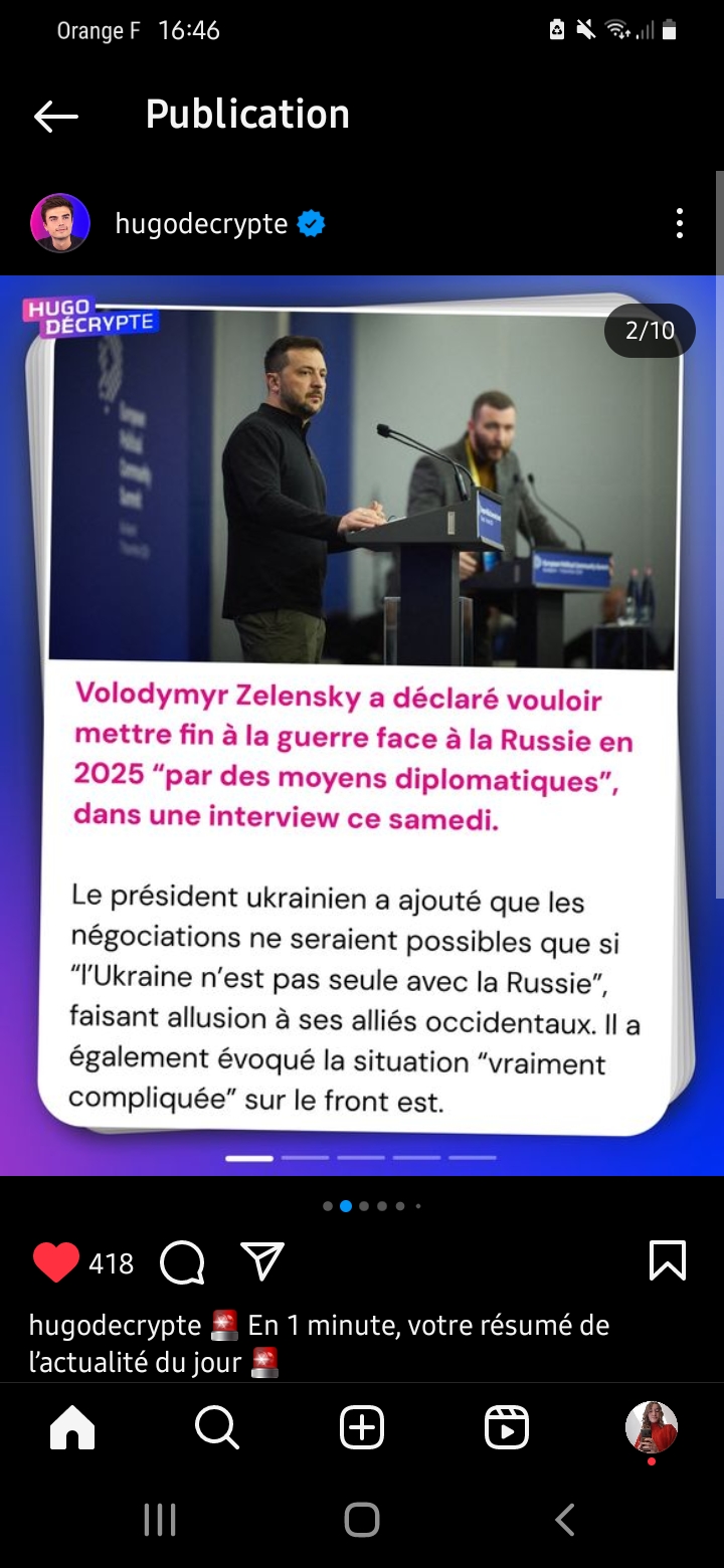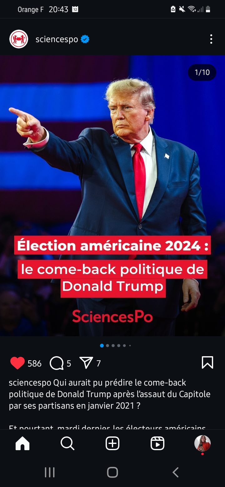 [Prof Doc] Alors là ? [Emma] Alors là c'est toujours sur Instagram et c'est un post de Sciences Po ... Là c'est les professeurs de Sciences Po qui on fait un récapitulatif pour les élections américaines et le retour de Trump... Ce que ça allait donner pour les prochaines années. [Prof Doc] Et donc ce type de contenu, de synthèse comme ça, qui sont réalisés par les comptes que vous suivez, c'est quelque chose que vous appréciez ? [Emma] Oui, c'est surtout ça que je regarde. Et puis là comme c'est des enseignants-chercheurs, c'est aussi intéressant.