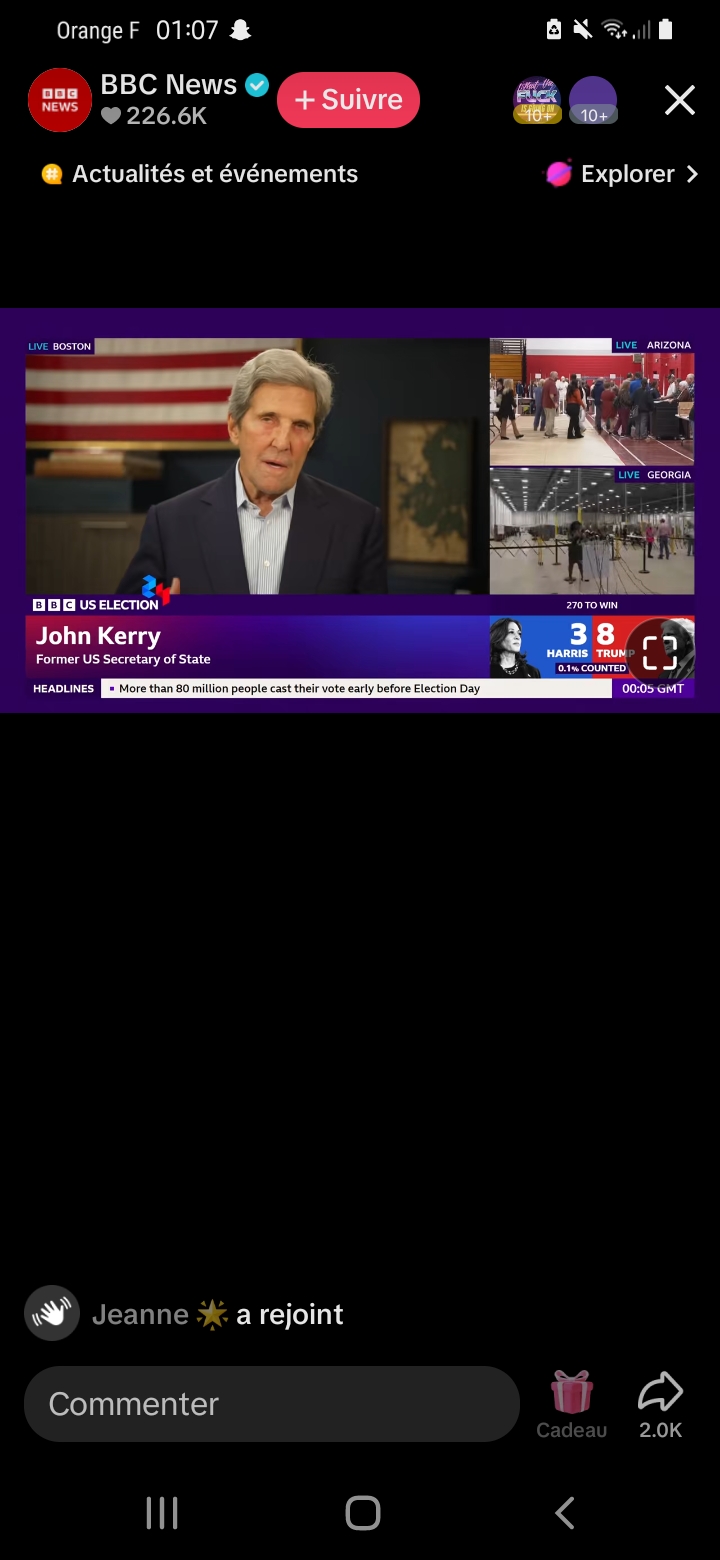 [Prof Doc] Donc on passe à une seconde photo. Alors là, moi je vois une image de John Kerry. Ca à l'air d'être une capture d'écran d'une vidéo, vous pouvez m'en dire plus ? [Emma] Donc en fait, c'était le jour des élections américaines. Donc je suis allée sur TikTok et j'ai regardé la BBC News. Et donc c'était pour voir les résultats en direct des élections. Donc au moment, pile poil où ça tombait. Et il expliquait justement les résultats. Après, il expliquait pendant toute la nuit, mais je n'ai pas regardé. [Prof Doc] Oui, c'est ça, parce que le direct, c'était en décalage… [Emma] C'était en direct parce que c'était à 1h du mat' du coup. [Prof Doc] Donc à 1h du mat', vous étiez en train de... Ok, c'était vraiment un truc que vous vouliez connaître. [Emma] Oui, c'est quand même important. Donc, oui. [Prof Doc] D'accord. Et donc, là, vous avez parlé de TikTok. Vous l'utilisez comment cette plateforme ? [Emma] Après, je regarde aussi pour des trucs personnels, mais aussi pour s'informer. Parce que je suis aussi abonnée à Hugo Décrypte, Le Monde, France Info. Je suis aussi à la BBC. [Prof Doc] D'accord. Donc vous jonglez d'une plateforme à l'autre comme ça ? [Emma] Oui, mais je suis plus sur Instagram. [Prof Doc] Oui, d'accord. Et donc là, pourquoi avoir suivi ce compte de la BBC News en particulier ? [Emma] En fait, je voulais un compte de gens qui parlaient anglais parce que je trouvais qu'ils étaient plus concernés. Et au début, je cherchais celui des Américains, mais je n'ai pas trouvé directement. Je cherchais dans mes abonnements et je n'ai pas trouvé.Du coup, j'ai pris la BBC. |