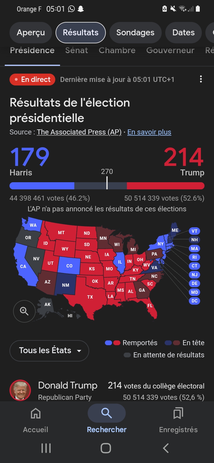 [Prof Doc] Ok, très bien. Alors là, on est devant une carte. J'ai l'impression que c'est issu de France Info ou non ? Pardon, je dis une bêtise. En tout cas, c'est une carte des élections américaines. [Emma] Oui, en fait, c'est sur Google. J'ai tapé « résultats en direct de l'élection américaine » et là, il y a la source Associated Press. Donc ça, c'est un média américain. C'est ça que je cherchais justement. Ils donnent les résultats. Donc en fait, avant que les résultats officiels soient tombés, ils attendent que ce média confirme les résultats. [Prof Doc] Ok, et donc là, c'est toujours du direct. Il est quelle heure quand vous prenez cette capture ? 5 heures du matin ? [Emma] Oui, mais en fait, je me suis réveillée à 1 heure et après à 5 heures. [Prof Doc] Et pourquoi vous aviez tellement envie de suivre cet événement d'actualité ? [Emma] Il y a quand même un impact sur le monde entier. Et puis, c'est important parce que moi, je voulais aller aux Etats-Unis pendant mes études pour faire un projet pendant une année. Mais du coup, je voulais voir qui allait être élu justement parce que si j'y vais, c'est dans 3-4 ans. Donc, je voulais voir qui serait élu.
