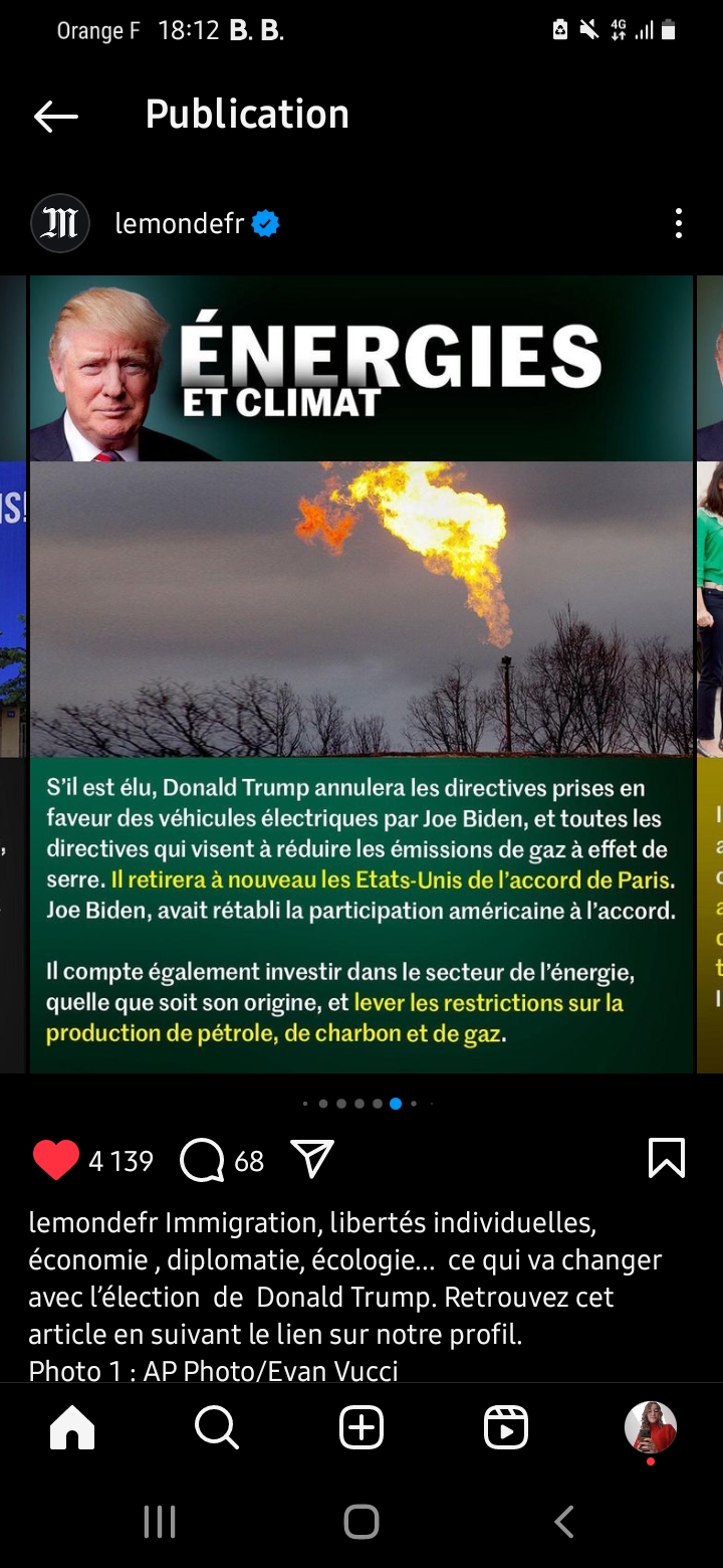 [Prof Doc] Alors là, on est donc sur une capture d'écran issue du journal Le Monde où on voit donc une photo de Donald Trump avec une image avec un puits de pétrole en flamme. Alors, pourquoi avoir choisi cette image ? [Emma] En fait, j'étais sur Instagram et du coup, je regardais Le Monde et ça montrait comment Donald Trump… tout ce qu'il avait dit sur s'il était élu, comment il allait réagir. Du coup, là, c'était sur l'énergie et le climat. Et du coup, ils expliquaient qu'il…Enfin, il souhaitait se retirer de l'accord de Paris. [Prof Doc] C’est quelque chose qui vous inquiète ? [Emma] Oui, un peu parce qu'ils font partie des plus gros pollueurs quand même du monde. [Prof Doc] Là, en fait, on accède au compte du journal Le Monde sur Instagram. Mais est-ce que parfois vous avez envie d'approfondir certains articles? [Emma] Des fois, ils mettent dans leur story, ils mettent le titre des articles et mettent à suivre sur ce lien. Et c'est un truc qui m'intéresse, qui m'intéresse. Oui, du coup, je vais voir. [Prof Doc] Mais alors vous êtes abonné au Monde aussi? Non ? non. D'accord. [Emma] Il n'y a que L'Eveil que je lis en presse papier.