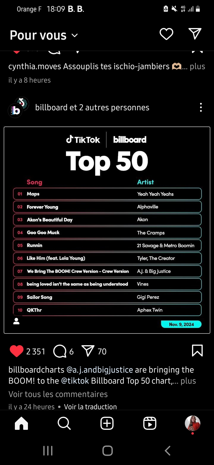 [Prof Doc] OK. Alors là, il faut nous dire... [Emma] C'est un média américain, donc c'est Billboard. Et en fait, c'est par rapport à tout ce qui est musique culturelle, tout ça. Et donc là, il fait un classement des chansons qui étaient les plus écoutées cette année, cette semaine, je crois. [Prof Doc] D'accord. [Emma] Sur Tik Tok. Et donc, je regarde ça. Des fois, ça met des informations comme ça sur les célébrités. Qu'est ce qui sort quelque chose de nouveau ? Qu'est ce qui se passe actuellement ? Et voilà. [Prof Doc] Et donc, par exemple, ce type de classement, ça peut orienter vos écoutes musicales ou vos chansons? [Emma] Non, pas particulièrement. Mais c'est plus pour voir ce que les gens écoutent. [Prof Doc] Sur les tendances. OK, merci. |