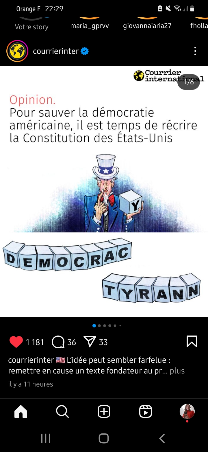 [Emma] Donc, c'est encore pour parler des résultats des élections américaines. Et oui, du coup, je regarde aussi Courrier international tous les jours. Parce qu'en gros, ils lisent toute la presse internationale et après, ils font un résumé en français de tout ce qu'ils ont lu… un peu partout. Et du coup, ils expliquent par rapport à la Constitution [des Etats-Unis ndlr] s’il faudrait la réécrire ou pas. Est-ce que ça restera un pays vraiment démocratique ou pas ? [Prof Doc] Et donc, Courrier international, vous suivez ce compte aussi ? [Emma] Oui, du coup, oui, tous les jours.