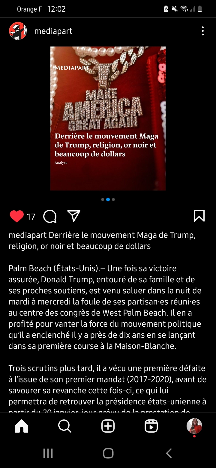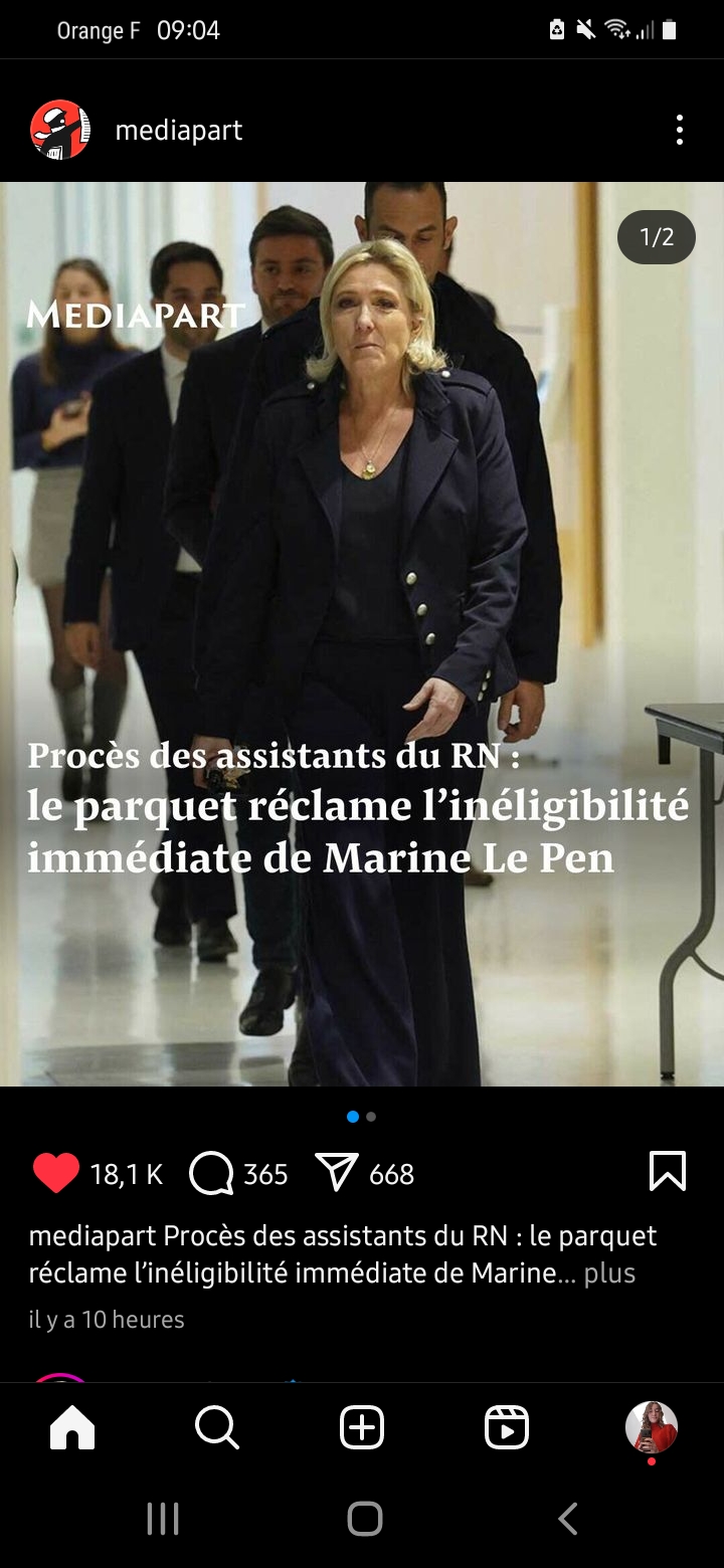 [Emma] Donc là c'est sur Mediapart. [Prof Doc] On est sur Instagram. Oui toujours. [Emma] Et donc là c'était pour parler du procès du RN. [Prof Doc] Oui avec Marine Le Pen. [Emma] Donc là ce n’est plus l'actualité des Etats-Unis mais plutôt en France. Et oui du coup parce qu'ils avaient fait une enquête et tout. [Prof Doc] Et d'accord. Et donc cette enquête c'est encore une fois Mediapart, c'est un site où il faut s'abonner pour pouvoir lire l'intégralité des enquêtes. Donc ça vous arrive d'être freinée dans vos lectures, enfin dans vos envies de vous informer parce qu'il faut payer c'est ça ? [Emma] Quelquefois mais après comme ils font le résumé de l'article. [Prof Doc] Et c’est plutôt ce format qui vous convient ? [Emma] Oui. D'accord. [Prof Doc] C'est au format synthétique court. D'accord.
