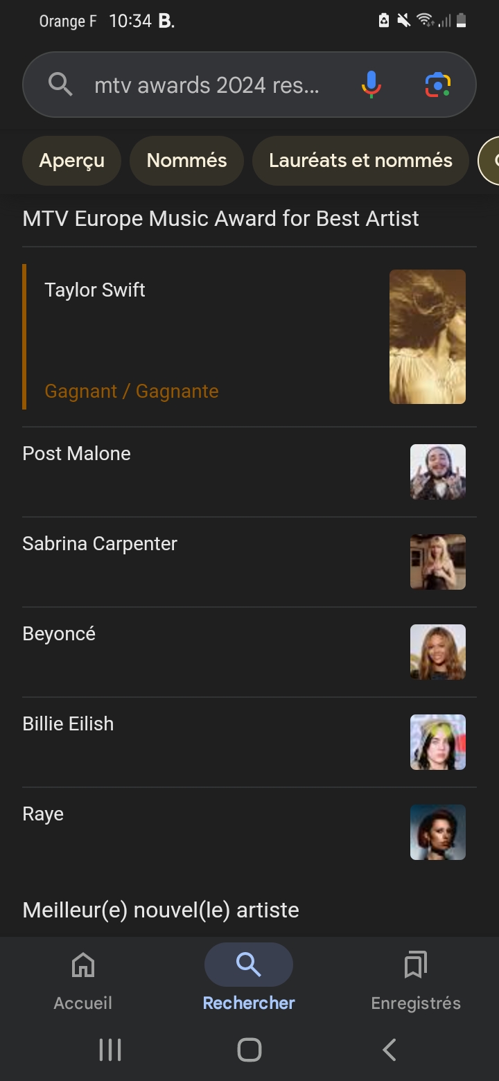 [Prof Doc] Alors là, c'est une capture d'écran. Faut nous dire. [Emma] En fait, là, je regardais qui avait gagné. Donc, c'est un prix aux Etats-Unis. [Prof Doc] Oui, donc les MTV Awards. [Emma] Oui, ça. Et je ne savais plus qui avait gagné en 2024. Et du coup, je regardais qui était nominé et qui avait gagné. [Prof Doc] Donc là, on est sur quoi ? [Emma] C'est sur Google. J'ai vraiment tapé ça et ça met le premier truc qui venait. [Prof Doc] Donc, Google a déjà classé l'information. Et vous vous arrêtez ici ou vous cliquez plus loin ? [Emma] Non, là, je me suis arrêtée ici parce que je ne cherchais pas plus. [Prof Doc] Oui, d'accord. [Emma] Mais après, des fois, si je veux en savoir plus, par exemple, si je ne sais pas qui est la personne qui a gagné, je peux rechercher. [Prof Doc] D'accord. [Emma] Pour savoir ce que la personne chante, ce qu'elle a écrit... [Prof Doc] Pour approfondir. [Emma]