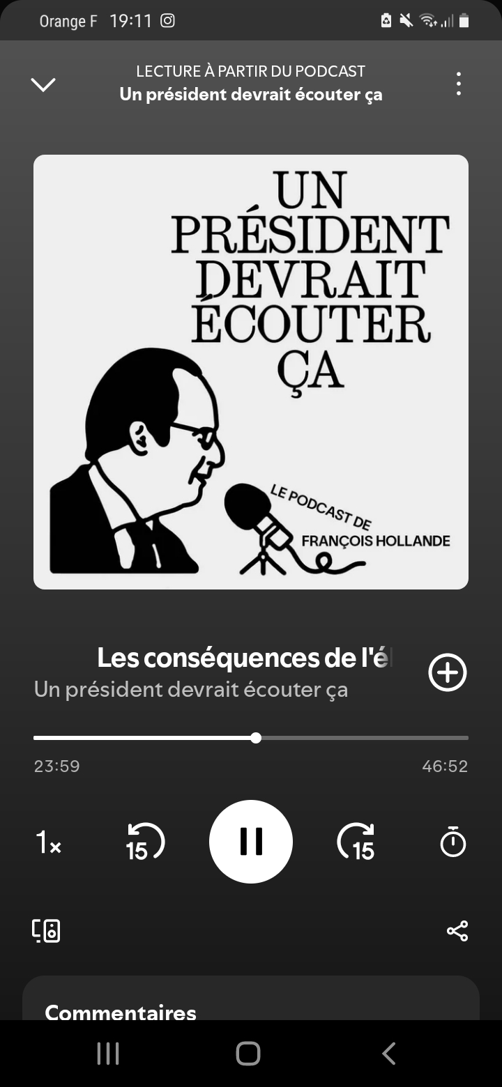 [Emma] Alors là c'est sur Spotify, donc j'écoutais un podcast, en fait c'est celui de François Hollande parce qu'il a décidé de sortir un podcast et je voulais savoir un peu de quoi ça parlait, ce qu'il disait... et donc cet épisode, ça parlait des conséquences de l'élection aux Etats-Unis. Et en fait, il avait fait intervenir une journaliste américaine mais qui parle en français, et il lui posait des questions... et vu que la journaliste elle habitait aux Etats-Unis, elle disait directement l'impact que ça avait sur sa vie et tout ça. [Prof Doc] Et vous êtes allée sur ce podcast parce que cet épisode là parlait des élections américaines ? [Emma] Parce que ça parlait des élections américaines et aussi parce que je voulais savoir un peu, c'était le premier épisode de son podcast et je voulais savoir un peu ce que ça donnait quoi. [Prof Doc] Oui d'accord. Et vous écoutez des podcasts dans votre pratique régulière ? [Emma] Oui des fois, quand je suis dans le bus, des fois Le Monde sort un podcast le soir et du coup j'écoute ça pour les informations de la journée.
