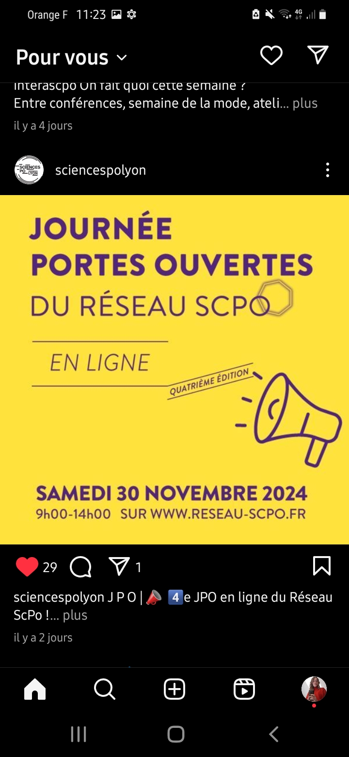 [Emma] Donc là c'est toujours sur Instagram. Et en fait c'est Sciences Po. Et du coup ils informaient quand est-ce que c'était leur journée portes ouvertes en ligne. [Prof Doc] Et donc parce que c'est un projet d'orientation pour vous ? Oui. Ouais et donc vous suivez peut-être des comptes d'école c'est ça ? [Emma] Oui c'est ça. Et du coup je voulais savoir la date de leurs portes ouvertes. [Prof Doc] D'accord. Et donc voilà vous vous informez. La plateforme en fait vous sert de veille informationnelle, c'est-à-dire que vous recevez des alertes sur les comptes qui vous intéressent notamment là sur les écoles pour avoir des dates importantes. [Emma] Oui. Dès qu'ils postent une publication, j'ai une notification. [Prof Doc] Voilà vous avez créé une alerte. D'accord.