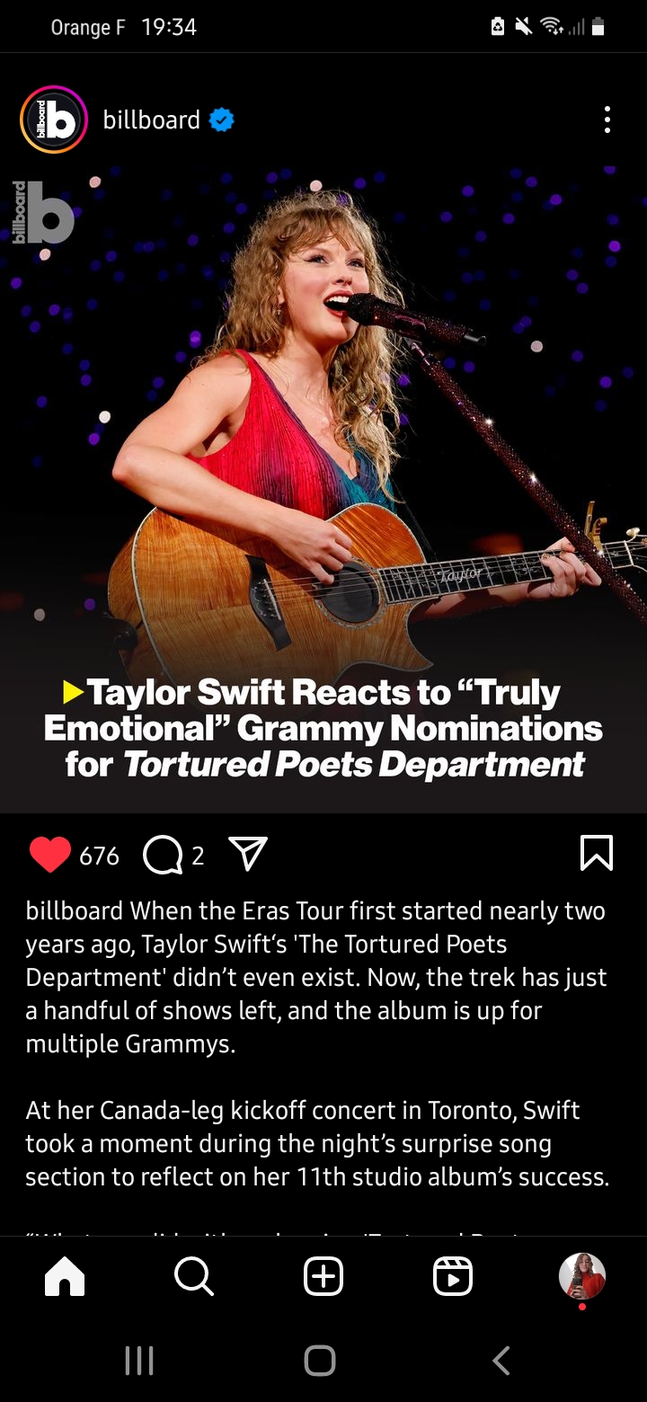 [Emma] Donc là c'est toujours Billboard. Donc là c'est pas un classement. Donc là c'est juste une information. Donc il y a eu les nominations pour des prix les Grammys Awards. Et donc là c'était Taylor Swift qui avait réagi. [Prof Doc] Et de suivre l'actualité comme ça du monde de la culture avec Billboard. Encore une fois ça influence vos choix culturels ? Vos choix d'écoute ? Vos choix de lecture ? Vos choix de... [Emma] Bah des fois oui. Mais c'est pour aussi savoir parce qu'en tendance comme vous avez dit. [Prof Doc] Ouais c'est ça. C'est les tendances qui vous intéressent. [Emma] Ouais plus.