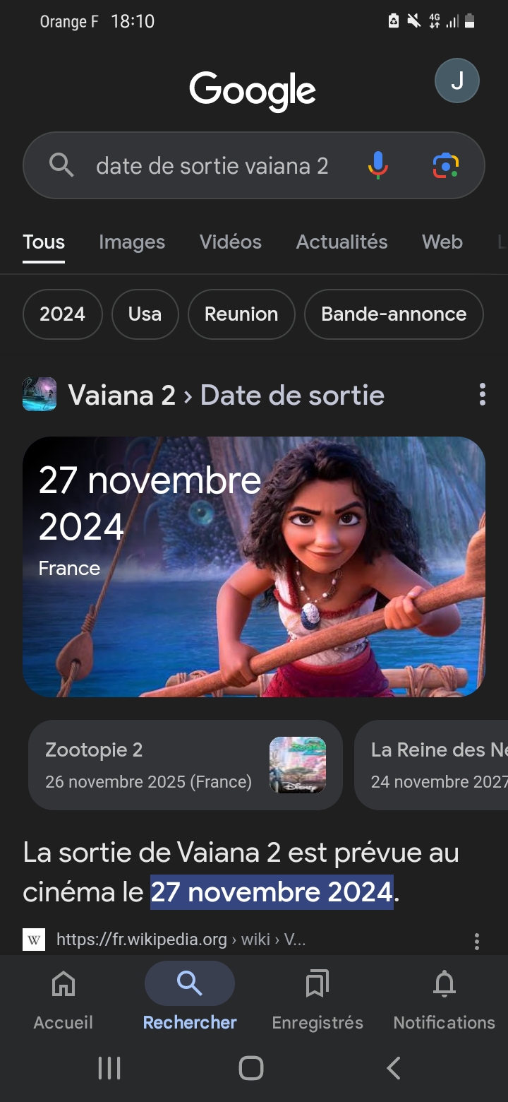 [Emma] Donc là c'est sur Google et j'ai cherché la date de sortie de Vaiana 2. Et du coup en fait directement sur Google ils m'ont proposé. Et puis après ils m'ont dit vous pouvez en savoir plus sur Wikipédia. En fait c'est un extrait de l'article de Wikipédia. Et après ils proposaient d'en voir plus. [Prof Doc] Donc là, l'idée c'est une recherche rapide pour avoir l'information rapidement. [Emma] En plus c'est même en surligné donc on n'a pas besoin de chercher.