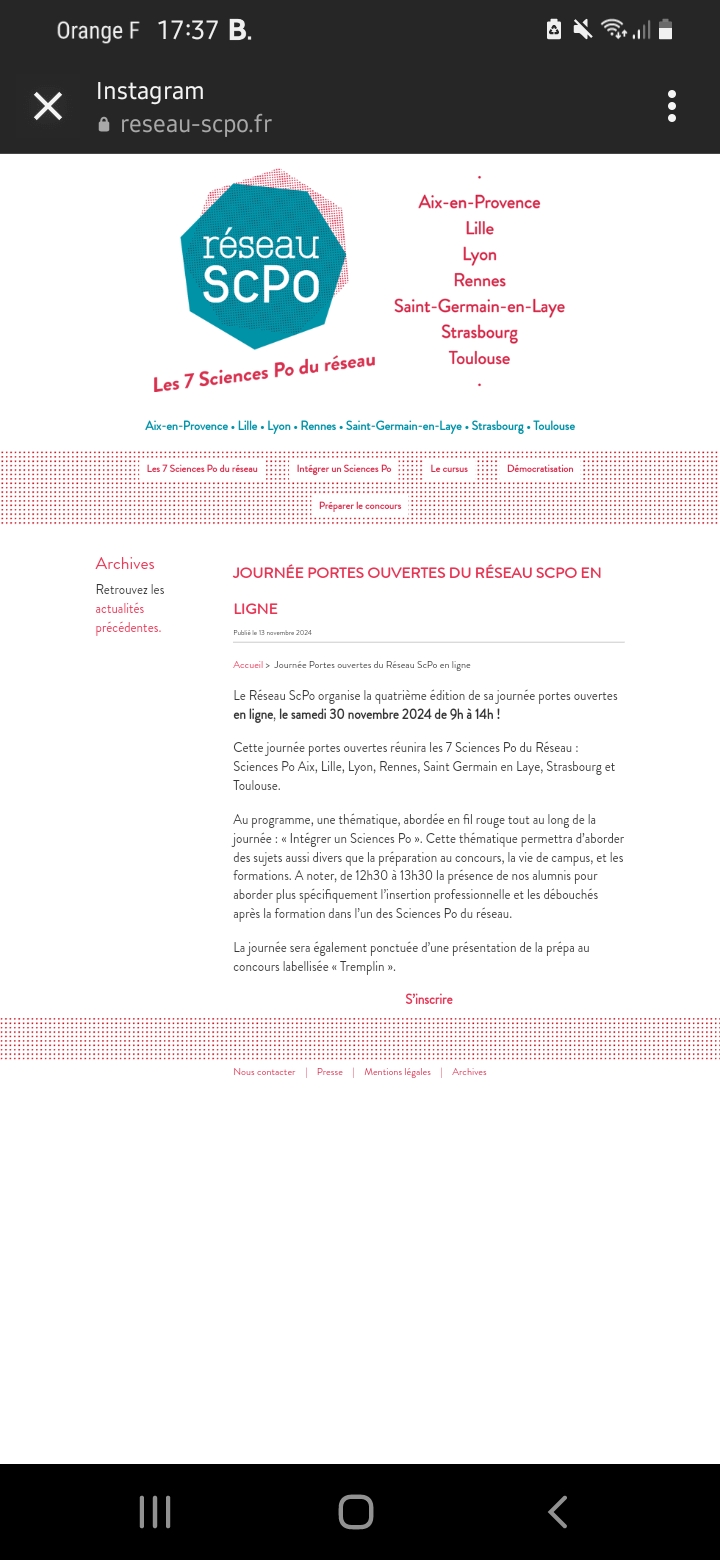 [Emma] Et donc là c'est le site de réseau Sciences Po. Donc dedans il y a Sciences Po Lyon par exemple. Et donc c'est pour en savoir plus sur leur journée portes ouvertes. Et du coup ils donnaient vraiment les horaires et tout. Et donc là c'est leur site. On voit pas trop bien mais sur ordi on voit mieux. [Prof Doc] Oui. [Emma] Et du coup ils donnent les horaires, comment ça va se passer, est-ce qu'il y a les élèves qui vont intervenir. [Prof Doc] Justement au niveau de l'utilisation des terminaux informatiques que vous utilisez. Donc là vous êtes sur le smartphone et là typiquement sur ce type de document vous basculeriez sur un ordinateur classique ? [Emma] Si j'ai besoin de plus approfondir. Oui. Par exemple souvent quand je vais sur le téléphone parce que j'ai besoin d'un truc rapide. Mais quand je vais sur les sites de Sciences Po ou même du réseau Sciences Po, je vais sur mon ordi pour regarder. Et par exemple tous mes mails, je les regarde plutôt sur mon ordi que sur mon téléphone. [Prof Doc] Et c'est un ordinateur portable ou fixe, c'est à la maison ? [Emma] Un ordinateur portable c'est celui de la région [Normandie ndlr] [Prof Doc] …de la région Normandie là qui vous a fourni. D'accord. Et comment, si on équilibrait un peu le ratio utilisation du téléphone et de l'ordinateur, ça serait quoi à peu près ? [Emma] J'utilise plus mon téléphone. Mon ordinateur, je l'utilise plus pour travailler… donc j'utilise plus mon téléphone… même pour m'informer. [Prof Doc] Oui. [Emma] Après si j'ai besoin par exemple de faire un exposé sur un sujet, là je vais plutôt sur mon ordi. [Prof Doc] D'accord. [Emma] Pour vraiment rechercher des articles longs. Mais après je peux chercher des trucs aussi sur Instagram. [Prof Doc] En parallèle ? [Emma] Ouais.