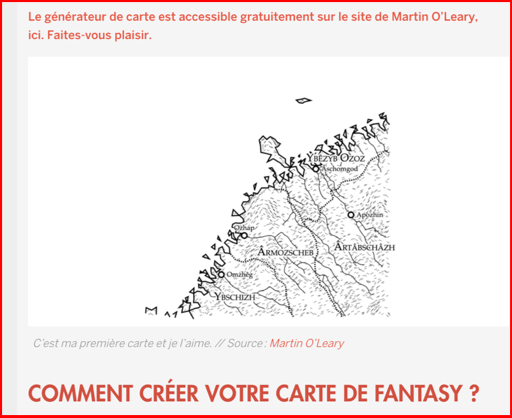 - Un site amusant, qui nous explique comment construire une cartographie imaginaire (pour les fans du Mordor et de la Comté, mais pas seulement). Ce genre d'outils nous permet de développer la créativité et la narration (utile donc en Arts, en Lettres, en Langues, etc.)