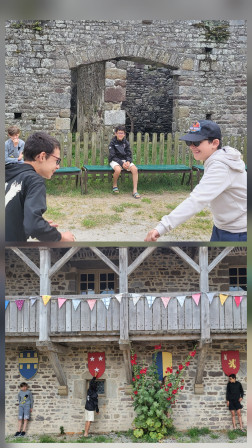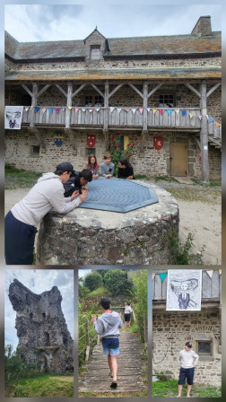 Ensuite, nous sommes allés visiter les ruines du château de Régneville. Il y avait des puits. On a assisté à un spectacle médiéval moderne avec un brin de paille et deux spectateurs!!! Qui est caché derrière la rose trémière?