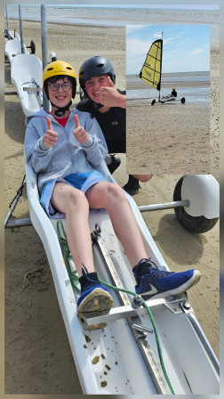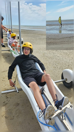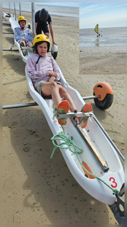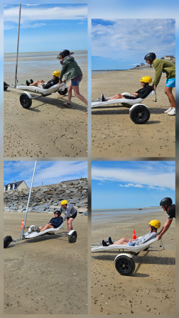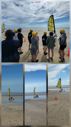 Avant de hisser la voile, on a mis des algues bah non un casque bien sûr, on n 'a pas encore de perruque!!! On a fait un tour sans voile pour comprendre comment diriger le char. Une fois la voile posée c'était reparti, attention le vent soufflait fort. On devait tirer la corde pour tendre la voile et accélérer et relâcher la corde pour ralentir. Ca allait vraiment vite surtout dans les virages, on devait suivre le parcours. Certains adultes ont écrasé des plots nous on a assuré. Avec la vitesse, le sable et l'eau ont sauté à notre visage, on était décoré. On s'est bien amusé.