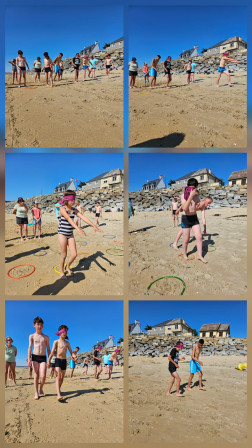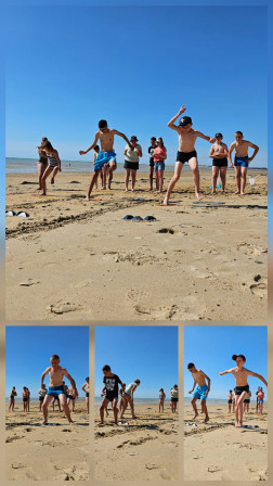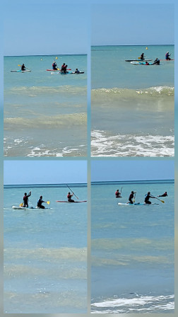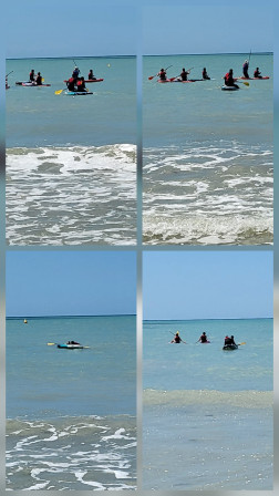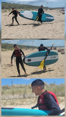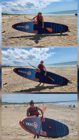 L'après-midi, on a fait du paddle. Le paddle c'est une planche, on doit s'asseoir dessus et on a une rame. Avant de commencer, on a mis une combinaison de plongée pour avoir chaud dans l'eau puis un gilet de sauvetage. Ensuite, on a emmené notre paddle jusqu'à la plage puis nous voilà partis dans l'eau. Il y avait un vent de terre qui nous poussait vers le large, on a du beaucoup pagayer pour rester dans la zone des bouées jaune. On est souvent tombé dans l'eau, c'était amusant mais épuisant. Il fallait changer de planche sans tomber. C'était une activité super géniale.