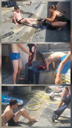 En revenant, on a rincé les combinaisons et les gilets et on a pris une bonne douche bien chaude.