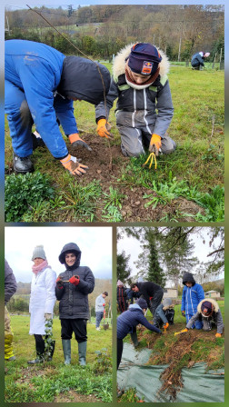 Nous avons planté des arbres dans un champ. On devait d'abord creuser des trous, avec des pelles et des pioches. On était deux pour chaque arbre, un qui tenait l'arbre et un qui bouchait le trou.