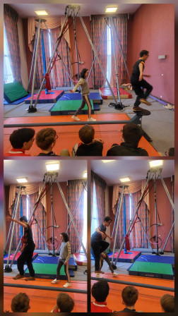 Il manque Nicolas au tissu et Lilou au fil qui étaient absents. On a bien aimé les séances de cirque, on a amélioré notre souplesse et renforcé nos muscles.