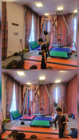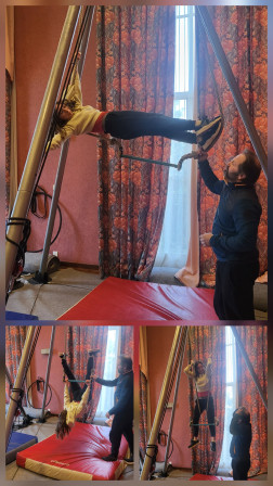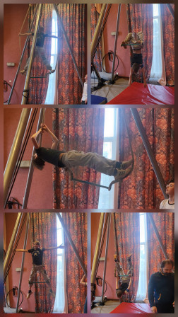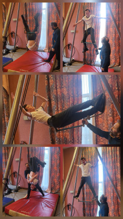 Enzo, Jade et Maeron ont fait des figures sur le trapèze comme l'étoile, la sirène, la lune et le soleil.