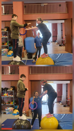 Léa et Berat sont montés sur la boule. Ils se sont lancés des cerceaux. Il faut savoir viser et receptionner.