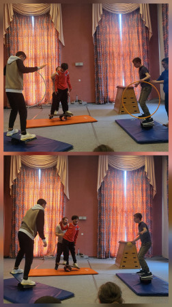Hugo, Samet et Hamza étaient sur les rolla-bolla. Ils se sont fait des passes avec un ballon et des cerceaux.