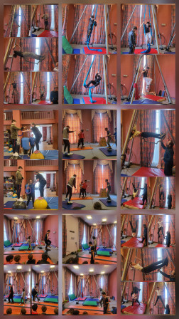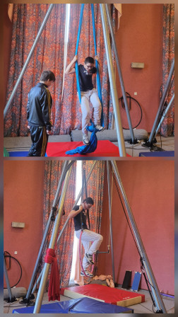 On a essayé la boule, le fil, le trapèze, le cerceau, le rolla-bolla, le tissu, les échasses, le bâton du diable, le diabolo, les assiettes, la poutre et plusieurs acrobaties.