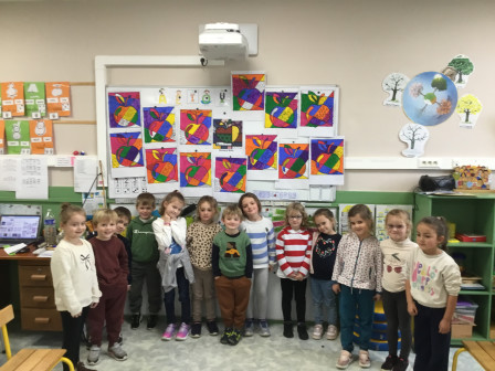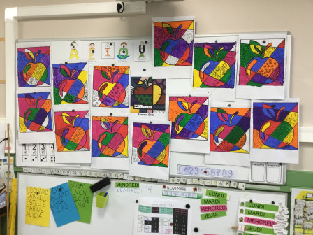 Après avoir observé le tableau de Romero Britto, nous avons peint notre pomme avec des couleurs vives et choisi des graphismes que l'artiste avait utilisé dans son tableau.