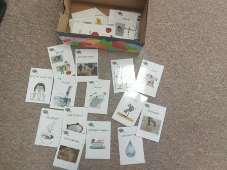 Nous continuons à mémoriser le vocabulaire et nous nous entraînons à raconter l'histoire en classe avec les figurines et le décor!