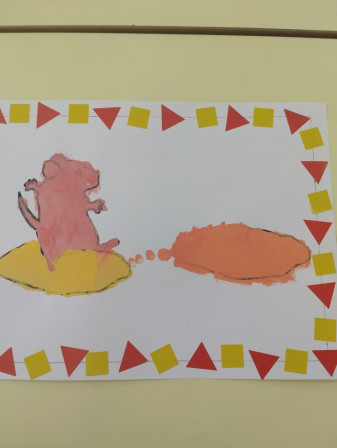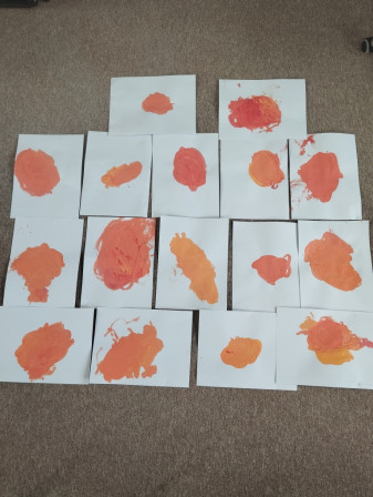 Comme la souris dans l'histoire, nous avons fait danser notre doigt dans la tache jaune et la tache est devenue orange!!