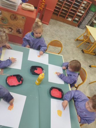 Nous avons déposé une tache de peinture jaune sur une feuille blanche et nous avons trempé notre index dans de la peinture rouge.