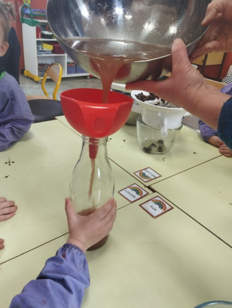 5.On a posé un entonnoir sur une bouteille et on a versé le jus du saladier dans la bouteille.