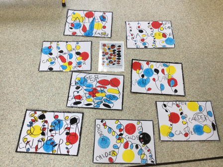 En classe, nous avons travaillé en graphisme sur les boucles. Nous avons regardé une vidéo sur un artiste qui avait réalisé des tableaux à partir de boucles. Nous avons essayé sa technique en reprenant les couleurs utilisées dans ses oeuvres, le noir, le rouge, le bleu et le jaune.