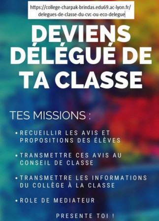 Les délégués de classe sont chargés de représenter les élèves de la classe. Ils sont les porte-paroles des élèves auprès des professeurs et des personnels d'éducation, notamment au moment du conseil de classe. Ils assistent également aux conseils de classes.